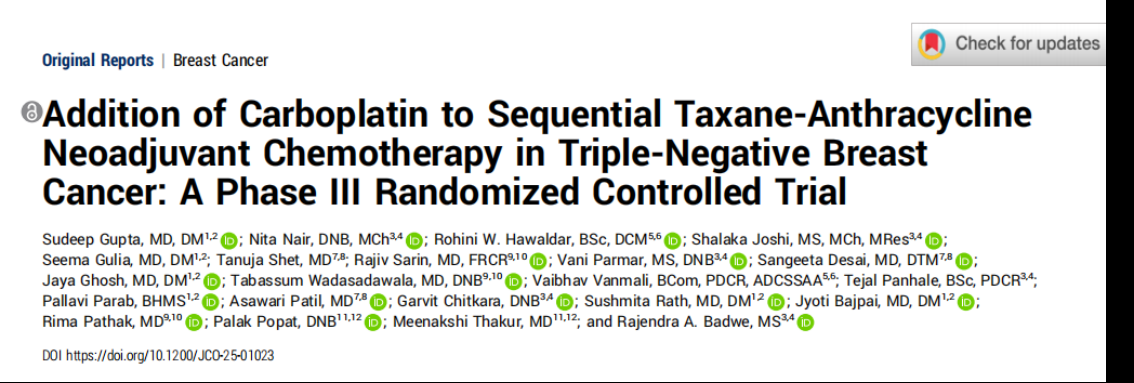 [1] Gupta S, Nair N, Hawaldar RW, Joshi ,Popat P, Thakur M and Badwe RA. Addition of Carboplatin to Sequential Taxane-Anthracycline Neoadjuvant Chemotherapy in Triple-Negative Breast Cancer: A Phase III Randomized Controlled Trial. J Clin Oncol 2026; 44: 9-19.